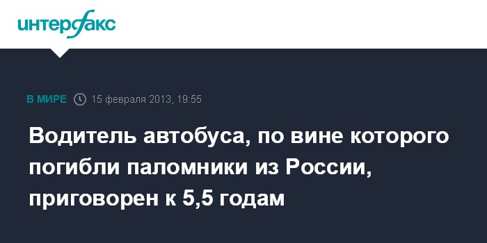 Киев. 15 февраля. INTERFAX.RU- Черниговский районный суд приговорил гражданина Российской Федерации, по вине которого 7 июля 2012 года в ДТП погибли 16 паломников из Псковской области, к 5 годам и 6 месяцам лишения свободы.