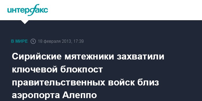 Лондон. 18 февраля. INTERFAX.RU - Сирийские мятежники в понедельник взяли под контроль блокпост недалеко от аэропорта города Алеппо, сообщает базирующийся в Лондоне Наблюдательный совет по правам человека в Сирии.