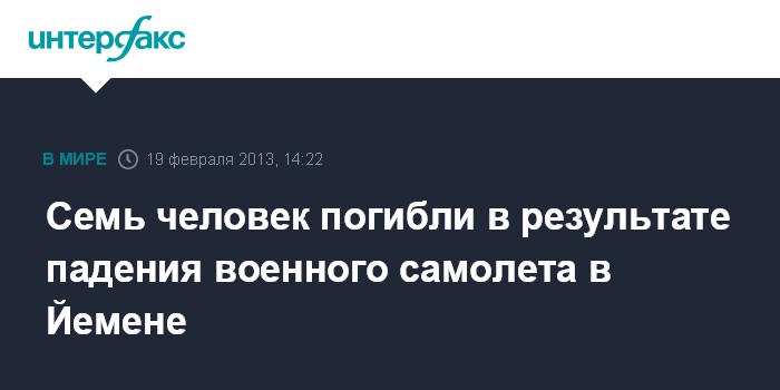 Дубай. 19 февраля. INTERFAX.RU - Не менее семи человек погибли в результате падения военного самолета на жилые кварталы столицы Йемена Саны, сообщил во вторник арабский телеканал "Аль-Арабия".