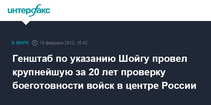 Москва. 19 февраля. INTERFAX.RU - Широкомасштабная проверка боеготовности, крупнейшая за последние 20 лет, проводится в Центральном военном округе (ЦВО).