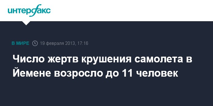 Дубай. 19 февраля. INTERFAX.RU - По меньшей мере 11 человек погибли, и еще не менее 15 человек получили ранения в результате падения военного самолета на жилые кварталы столицы Йемена Саны, сообщил во вторник межарабский телеканал Al Arabia.