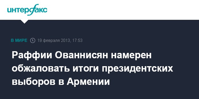 Ереван. 19 февраля. INTERFAX.RU - Кандидат в президенты Армении от оппозиционной партии "Наследие", экс-глава МИД Раффи Ованнисян намерен обжаловать итоги прошедших 18 февраля в стране президентских выборов.