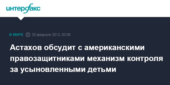 Москва. 20 февраля. INTERFAX.RU - Уполномоченный при президенте РФ по правам ребенка Павел Астахов встретится с президентом Американского союза профессионалов против жестокого обращения с детьми Рональдом Хьюзом, чтобы обсудить возможности отслеживания судьбы усыновленных в США российских детей.