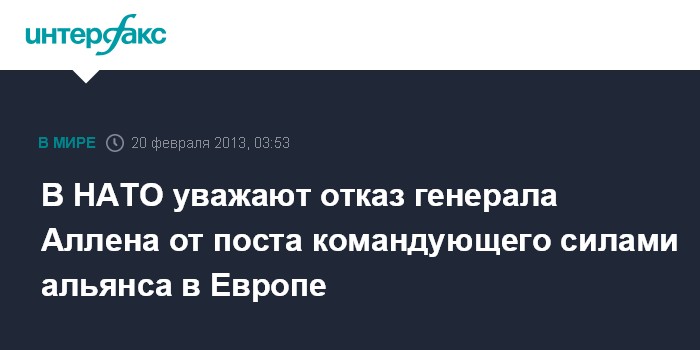 Брюссель. 20 февраля. ИНТЕРФАКС - В Североатлантическом альянсе с пониманием отнеслись к отказу американского генерала Джона Аллена от предложенного ему поста верховного главнокомандующего объединенными вооруженными силами НАТО в Европе, заявила в Брюсселе официальный представитель организации Оана Лунгеску.
