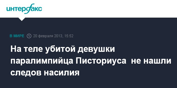 Йоханнесбург. 20 февраля. INTERFAX.RU - Результат вскрытия трупа Ревы Стенкамп, в убийстве которой обвиняют ее жениха, паралимпийского чемпиона Оскара Писториуса из ЮАР, не выявил никаких следов физического насилия, сообщил в среду в суде адвокат спортсмена Барри Ру.