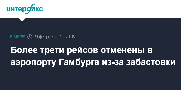 Берлин. 20 февраля. INTERFAX.RU - Забастовка сотрудников службы безопасности аэропорта Гамбурга в среду привела к отмене более трети рейсов, сообщили в руководстве аэропорта.