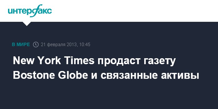Нью-Йорк. 21 февраля. INTERFAX.RU - The New York Times Company (NYT), контролирующая одноименную газету и ряд других изданий, объявила о готовящейся продаже газеты Boston Globe и связанных активов в Новой Англии (штаты северо-восточного побережья - Коннектикут, Мэн, Массачусетс, Нью-Гэмпшир, Род-Айленд, Вермонт).