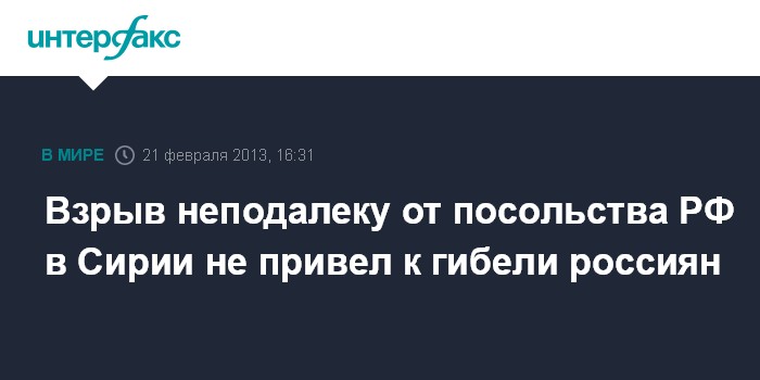 Москва. 21 февраля. INTERFAX.RU - Россиян нет среди погибших в результате взрыва в Дамаске близ российской дипмиссии в четверг, заявили "Интерфаксу" в посольстве РФ в Сирии.