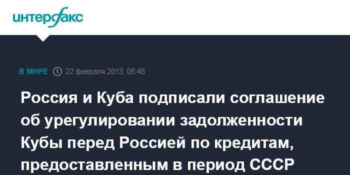 Гавана. 22 февраля. ИНТЕРФАКС - Россия и Куба парафировали соглашение об урегулировании задолженности Кубы перед Россией по кредитам, предоставленным в период СССР.