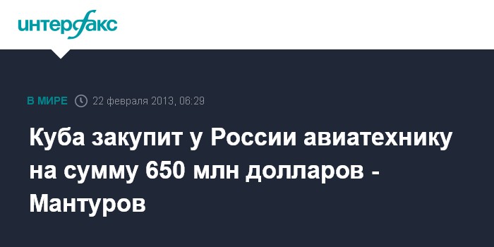 Гавана. 22 февраля. ИНТЕРФАКС - Куба закупит у России авиационную технику на 650 млн долларов, заявил глава Минпромторга Денис Мантуров в пятницу.