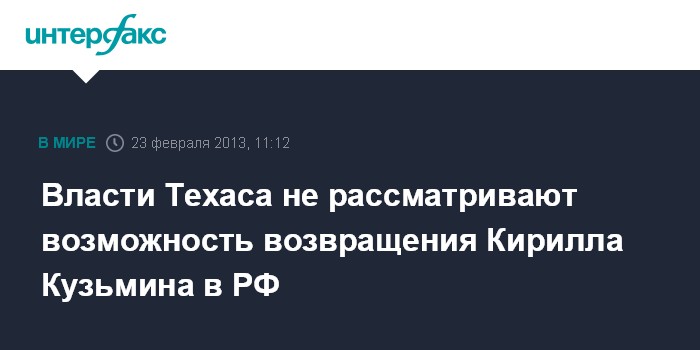 Вашингтон. 23 февраля. INTERFAX.RU- Вероятность того, что власти Техаса согласятся вернуть в Россию двухлетнего Кирилла Кузьмина, брата погибшего в приемной семье Максима Кузьмина, близка к нулю, сообщил в субботу телеканал Си-Би-Эс.