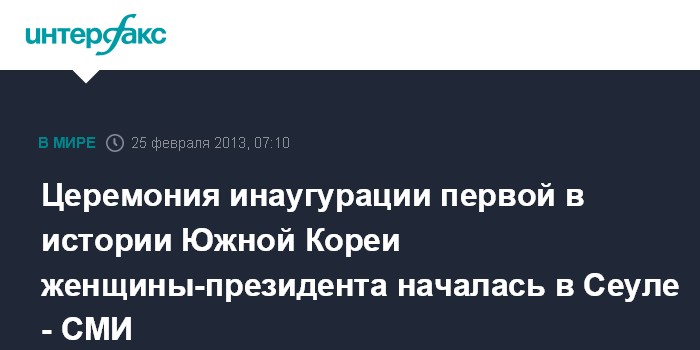 Сеул. 25 февраля. ИНТЕРФАКС - Церемония вступления в должность 18-го по счету главы Южной Кореи и первой женщины-президента Пак Кын Хе стартовала на площади перед зданием Национального собрания в центральном районе Сеула Еыйдо, сообщают местные СМИ в понедельник.