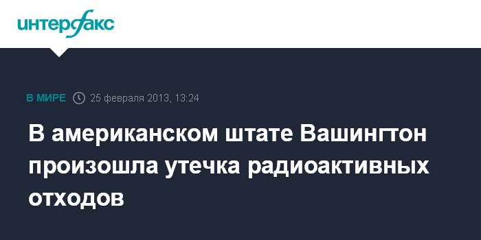 Лондон. 25 февраля. INTERFAX.RU - Власти штата Вашингтон обеспокоены утечкой радиоактивных отходов, передает в субботу британская телерадиокорпорация BBC.