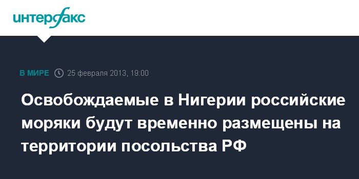 Москва. 25 февраля. INTERFAX.RU - В Москве позитивно оценили решение нигерийского суда об освобождении 15 российских моряков под поручительство российского посольства.