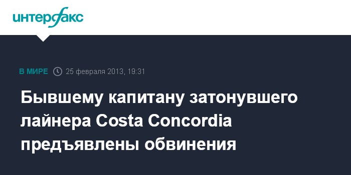 Рим. 25 февраля. INTERFAX.RU - Итальянская прокуратура выдвинула в понедельник официальные обвинения против бывшего капитана круизного лайнера Costa Concordia Франческо Скеттино, сообщило в педельникагетво AP.
