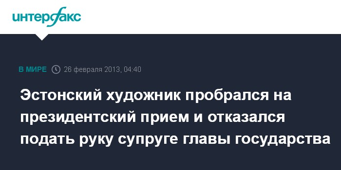 Таллин. 26 февраля. ИНТЕРФАКС - В Эстонии в воскресенье на президентском приеме в честь 95-годовщины независимости государства художник Меэлис Калдалу (Meelis Kaldalu) публично отказался подать руку супруге президента страны Эвелин Ильвес (Evelin Ilves).