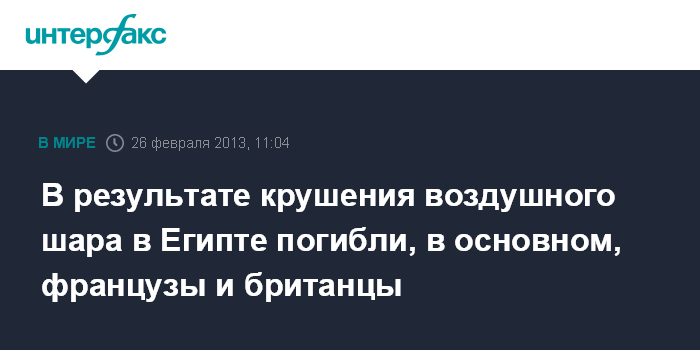 Каир. 26 февраля. INTERFAX.RU - Среди жертв крушения воздушного шара в Египте, в основном, значатся французы, подданные Великобритании, сообщает во вторник AP.