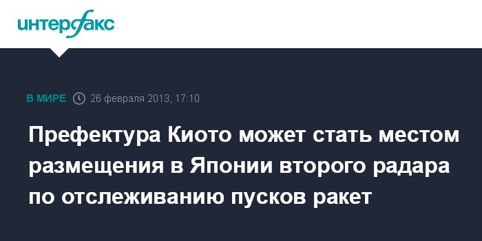 Токио. 26 февраля. INTERFAX.RU - Правительство Японии планирует разместить второй американский радар по отслеживанию пусков северокорейских ракет в префектуре Киото в центральной части острова Хонсю, передает японская телерадиокомпания NHK.