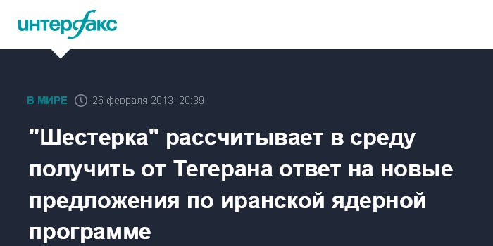 Алматы. 26 февраля. INTERFAX.RU - "Шестерка" международных посредников надеется в среду получить ответ от Ирана на новый пакет предложений по иранской ядерной программе, сказал пресс-секретарь верховного представителя Евросоюза по иностранным делам и политике безопасности Майкл Манн.