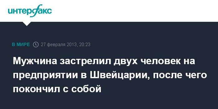 Женева. 27 февраля. INTERFAX.RU - Стрельба на деревообрабатывающем заводе "Кроноспан" в швейцарском кантоне Люцерн привела к гибели трех человек, сообщает в среду местная полиция.
