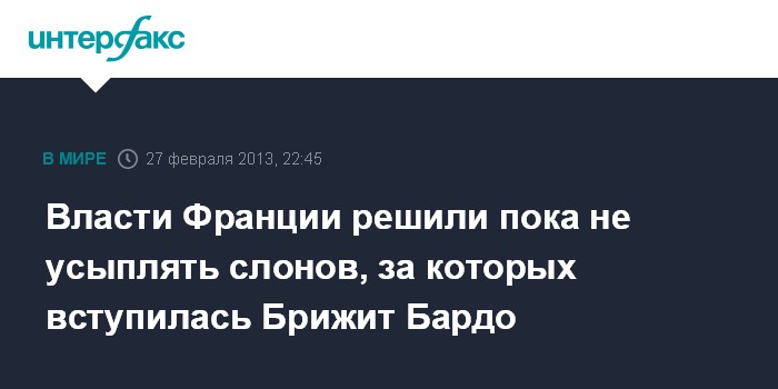 Париж. 27 февраля. INTERFAX.RU - Суд Франции приостановил решение об усыплении двух слонов из зоопарка Лиона, из-за которых актриса Брижит Бардо грозилась обратиться за гражданством России, сообщила в среду французская газета Le Figaro