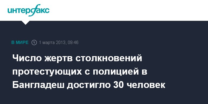 Дели. 1 марта. INTERFAX.RU - Количество погибших в ходе столкновений между демонстрантами и стражами порядка в Бангладеш возросло до 30 человек, сообщил в четверг индийский телеканал NDTV.