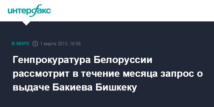 Минск. 1 марта. INTERFAX.RU - Генпрокуратура Белоруссии получила запрос из Киргизии о выдаче экс-президента Курманбека Бакиева и будет рассматривать его в течение месяца.