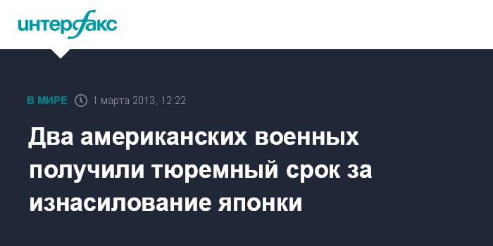Токио. 1 марта. INTERFAX.RU - Два американских солдата, осужденных за изнасилование и нанесение травм подданной Японии на острове Окинава в октябре 2012 года, получили тюремный срок, говорится в заявлении окружного суда города Нахи.