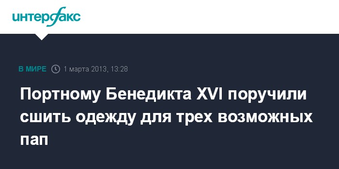Богота. 1 марта. INTERFAX.RU - Колумбийскому портному Луису Абелю Дельгадо, который шил одежду для Бенедикта XVI, за несколько недель до отречения папы римского поручили сшить одежду для богослужений для трех человек, передает в пятницу агентство EFE.