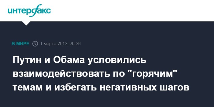 В сообщении отмечается, что разговор прошел по инициативе американской стороны. Лидеры условились плотно взаимодействовать по "горячим" международным темам, связанным с Сирией, ближневосточным урегулированием, Ираном, КНДР и планами в области ПРО. Как информирует пресс-служба, "лидеры были едины в стремлении избегать тех или иных шагов, способных негативно отразиться на двусторонних отношениях".
