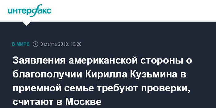 18 февраля стало известно, что в январе в американской приемной семье погиб М.Кузьмин. По факту произошедшего Следственный комитет России возбудил уголовное дело по ст.105 УК РФ (убийство). Прокуратура штата Техас выразила готовность взаимодействовать с российской стороной в расследовании смерти М.Кузьмина.