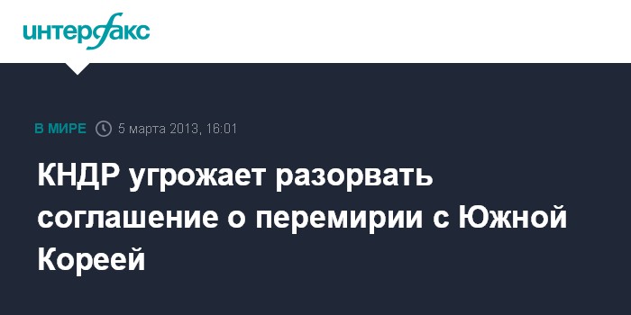 Сеул. 5 марта. INTERFAX.RU - Северная Корея во вторник выступила с угрозой разорвать соглашение о перемирии с Южной Кореей, подписанное по итогам Корейской войны 1950-1953-го годов, говорится в сообщении, распространенном по каналам государственного Центрального телеграфного агентства Кореи.