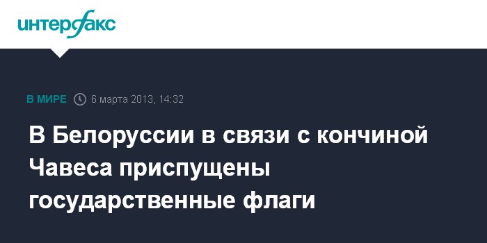 Минск. 6 марта. INTERFAX.RU - Президент Белоруссии Александр Лукашенко распорядился приспустить государственные флаги страны в связи с кончиной президента Венесуэлы Уго Чавеса, сообщает белорусское телевидение.