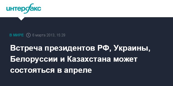 Киев. 6 марта. INTERFAX.RU - Встреча президентом России, Украины, Белоруссии и Казахстана предположительно пройдет в апреле, сообщил президент Украины Виктор Янукович.