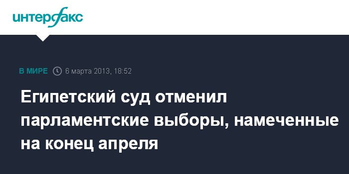 Каир. 6 марта. INTERFAX.RU - Суд Египта в среду постановил отменить дату парламентских выборов, которые должны были состояться в конце апреля, передает агентство EFE со ссылкой на источник в суде.