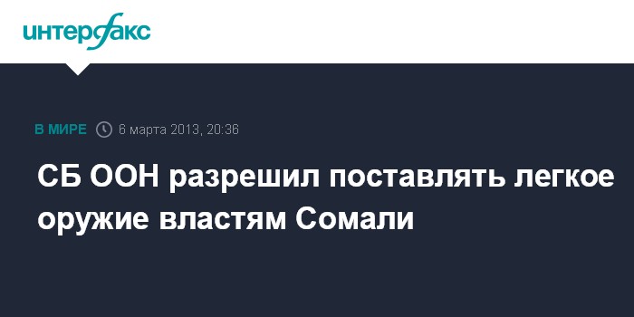 Нью-Йорк (ООН). 6 марта. INTERFAX.RU - Члены Совета безопасности ООН в среду единогласно одобрили резолюцию, предусматривающую, среди прочего, разрешение поставок легкого оружия властям Сомали.