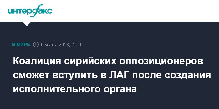 Дубай. 6 марта. INTERFAX.RU - Условием для вступления Национальной коалиции сирийских революционных и оппозиционных сил (НКСРОС) в Лигу арабских государств является формирование исполнительного органа, сообщает в среду межарабский телеканал Al Jazeera.