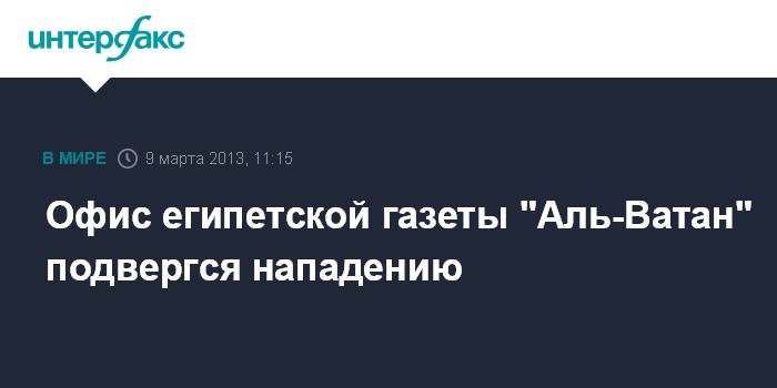 Каир. 9 марта. INTERFAX.RU - Более 40 человек совершили нападение на офис независимого египетского издания "Аль-Ватан", говорится в сообщении, опубликованном в субботу на веб-сайте газеты. "Более 40 человек подожгли вход в офис, ворвались внутрь и уничтожили все, что в нем находилось", - пишет "Аль-Ватан".