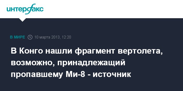 Москва. 10 марта. INTERFAX.RU - Конголезские спасатели обнаружили в джунглях часть хвоста вертолета Ми-8, сообщил "Интерфаксу" источник в силовых структурах в Москве.