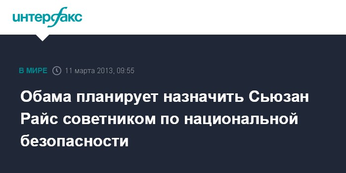 Вашингтон. 11 марта. INTERFAX.RU - Президент США Барак Обама планирует в течение 2013 г. назначить постпреда при ООН Сьюзан Райс своим советником по национальной безопасности, сообщает газета Washington Post