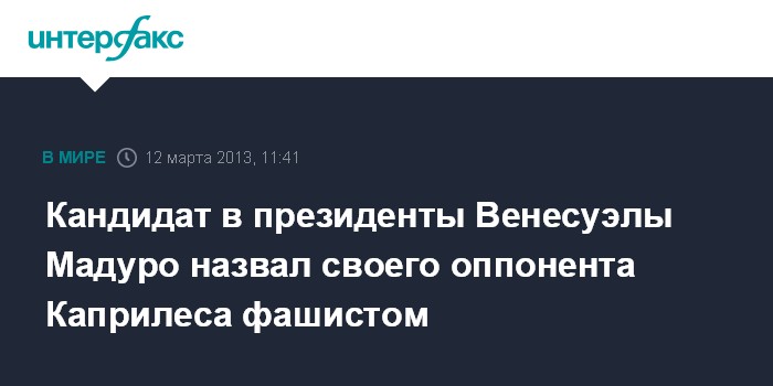 Каракас. 12 марта. INTERFAX.RU - Исполняющий обязанности президента Венесуэлы Николас Мадуро выступил с резкой критикой в адрес своего соперника на президентских выборах лидера венесуэльской оппозиции Энрике Каприлеса.