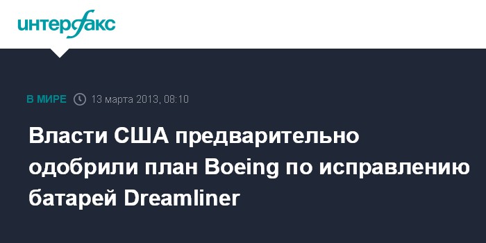 Нью-Йорк. 13 марта. INTERFAX.RU - Федеральное управление гражданской авиации (FAA) США предварительно одобрило разработанный Boeing Co. план по обеспечению безопасности батарей на модели 787 Dreamliner, сообщает The Wall Street Journal.