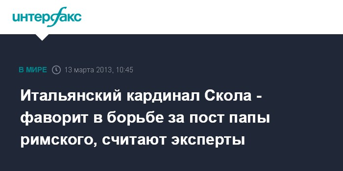 Рим. 13 марта. INTERFAX.RU - Опрос, в котором приняли участие специалисты по Ватикану со всего мира, показал, что итальянский кардинал Анджело Скола - главный фаворит стартовавшего во вторник конклава, пишет итальянская газета La Stampa.
