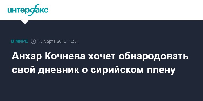 Киев. 13 марта. INTERFAX.RU - Гражданка Украины, журналистка Анхар Кочнева, которая освободилась из сирийского плена, обещает обнародовать свой дневник, посвященный ее пребыванию у сирийских повстанцев.