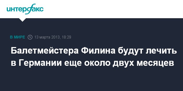 Москва. 13 марта. INTERFAX.RU - Художественный руководитель балетной труппы Большого театра Сергей Филин будет находиться на лечении в Германии до конца весны, сообщил "Интерфаксу" в среду информированный источник в российских медицинских кругах.