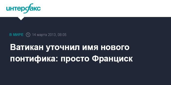 Лондон. 14 марта. INTERFAX.RU - Святой престол уточнил официальное имя нового папы римского - его следует называть просто Франциск, а не Франциск I, как поначалу сообщили СМИ.