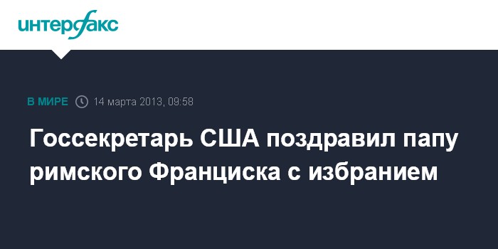 Вашингтон. 14 марта. INTERFAX.RU - Глава госдепартамента США Джон Керри поздравил новоизбранного папу римского Франциска от собственного имени и от имени руководства США, говорится в опубликованном в четверг заявлении госсекретаря.