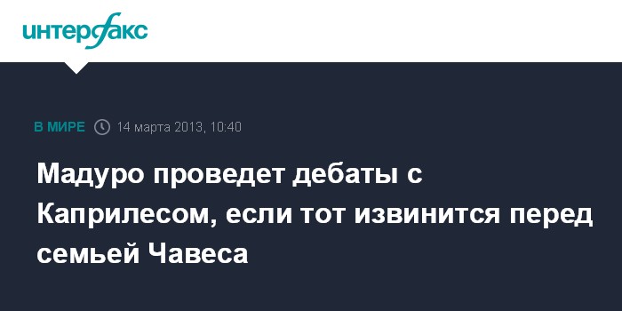 Каракас. 14 марта. INTERFAX.RU - Исполняющий обязанности президента Венесуэлы Николас Мадуро согласен провести предвыборные дебаты с лидером оппозиции Энрике Каприлесом, если тот попросит прощения у семьи скончавшегося лидера страны Уго Чавеса.