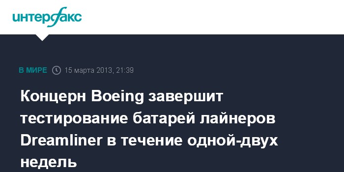 Вашингтон. 15 марта. INTERFAX.RU - Тестовые испытания батарей, используемых авиастроительным концерном Boeing Co. в самолетах 787 Dreamliner, завершатся в течение одной-двух недель, сообщил в пятницу на пресс-конференции в Нью-Йорке вице-президент компании Рон Хиндербергер.