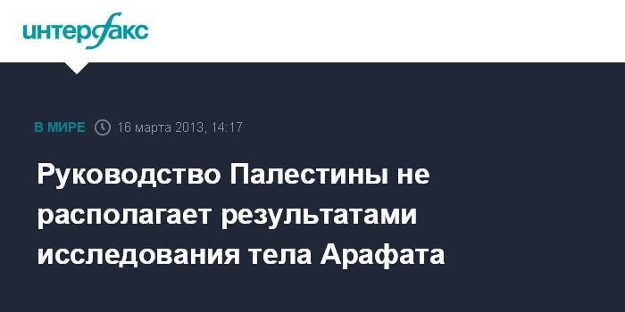 Черкесск. 16 марта. INTERFAX.RU - Руководство Палестины пока не получило результатов исследования тела бывшего главы государства Ясира Арафата, заявил лидер Палестины Махмуд Аббас в ходе визита в Карачаево-Черкесию. "Для изучения причины смерти господина Арафата в Палестину приезжали три комитета - из России, Франции и Швейцарии. Каждый комитет работает отдельно", - сказал М.Аббас. "Они обещали предоставить нам результаты исследований, когда они будут готовы", - добавил палестинский лидер.
